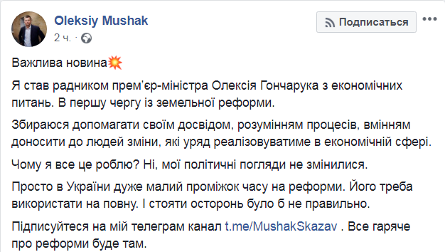 "Я стал советником премьер-министра Алексея Гончарука по экономическим вопросам. В первую очередь по земельной реформе. Собираюсь помогать своим опытом, пониманием процессов, умением доносить до людей изменения, которые правительство будет реализовывать в экономической сфере", - поделился планами Мушак.