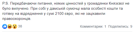 "Никаких ценностей у гражданки Князевой изъято не было. При себе в дамской сумочке были личные средства и наличные на командировку в сумме 2100 евро, которые правоохранителей не заинтересовали", – добавил Князев.