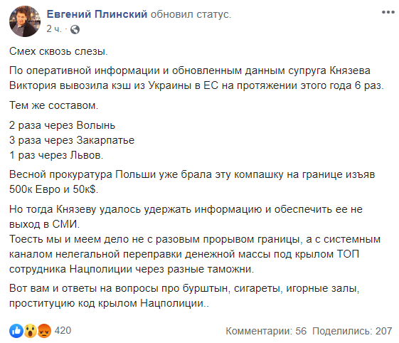 На своей странице в Facebook Сергей Князев указал, что они с бывшей женой стали объектом информационной атаки. Хотя факт перевозки крупной суммы через кордон признал. Но заявляет, что они принадлежали не его супруге.