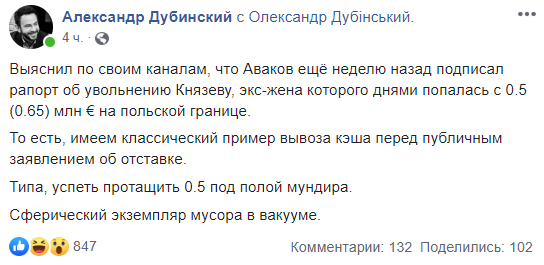 Народный депутат от "Слуги народа" Александр Дубинский заявил, что "Аваков еще неделю назад подписал рапорт об увольнении Князеву, экс-жена которого днями попалась с 0.5 (0.65) млн € на польской границе.