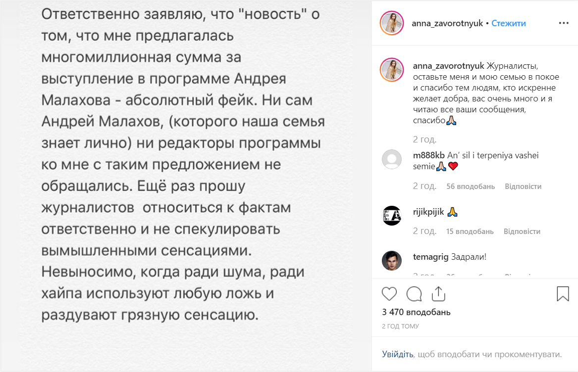 "Журналисты, оставьте меня и мою семью в покое, и спасибо тем людям, кто искренне желает добра", — написала Заворотнюк.