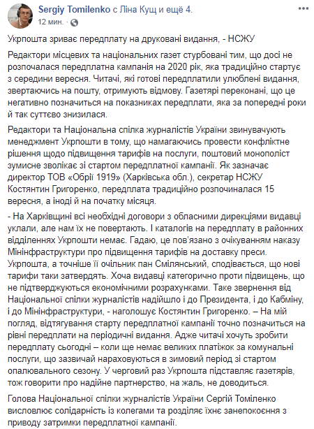 Подписная кампания на 2020 год, которая обычно стартует с середины первого месяца осени, по состоянию на 25 сентября до сих пор не началась. Редакторы местных и национальных газет обеспокоены. Об этом сообщает Национальный союз журналистов Украины (НСЖУ) на странице в Facebook.