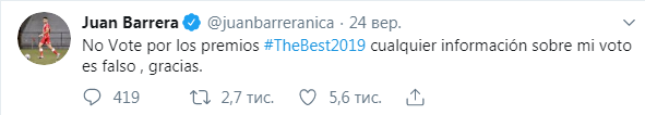 В своем Twitter-микроблоге Баррера написал: "Не голосовал за награду The Best-2019. Информация о моем голосе - ложная".