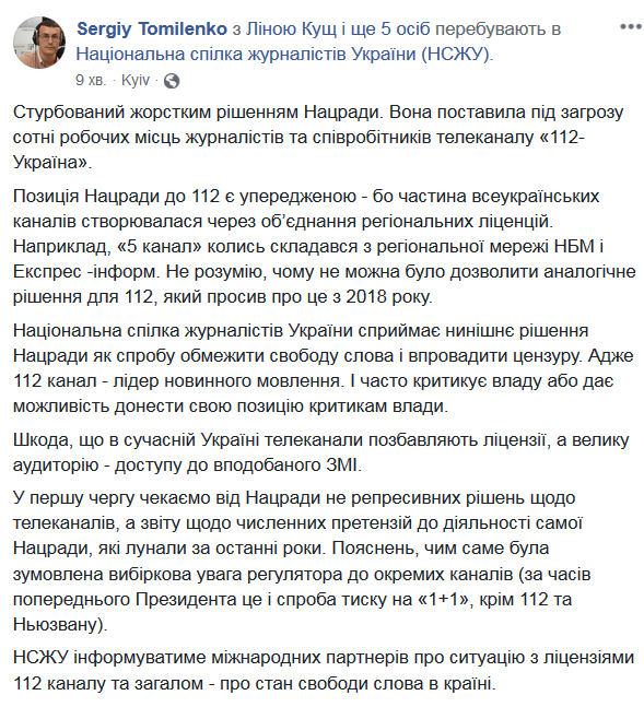 В Национальном союзе журналистов Украины (НСЖУ) крайне обеспокоены решением Нацсовета по ТВ лишить лицензий канал "112 Украина". Об этом глава НСЖУ Сергей Томиленко написал в своем Facebook.