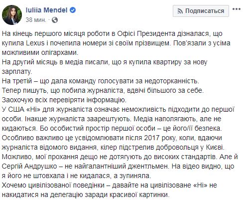 Мендель также призвала журналистов проверять информацию. "На конец первого месяца работы в Офисе Президента узнала, что купила Lexus и повесила номера со своей фамилией. Связали со всеми возможными олигархами. На второй месяц в медиа писали, что я купила квартиру за новую зарплату. На третьей-что дала команду голосовать за неприкосновенность. Теперь пишут, что избила журналиста, вдвое большего за себя", - написала пресс-секретарь Зеленского.
