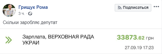 Народный депутат Роман Грищук рассказал сколько зарабатывает в месяц член парламента. Соответствующий скриншот показал на своей странице в Facebook вечером в пятницу.