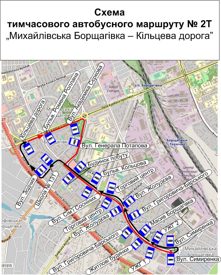 Напомним, что с 28 сентября отменили движение трамваев №2. Вместо них будут курсировать автобусы № 2Т по маршруту: Михайловская Борщаговка - Кольцевая дорога: ул. Симиренко - б-р Кольцова - ул. Литвиненко-Вольгемут - ул. Зодчих - ул. Леся Курбаса, в обратном направлении - ул. Леся Курбаса - ул. Владимира Покотило - б-р Кольцова - ул. Симиренко.