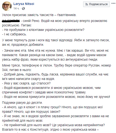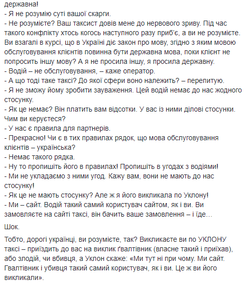 В Facebook она написала длинный пост о том, как ехала в такси, с водителем, который отказался разговаривать с ней на украинском языке.