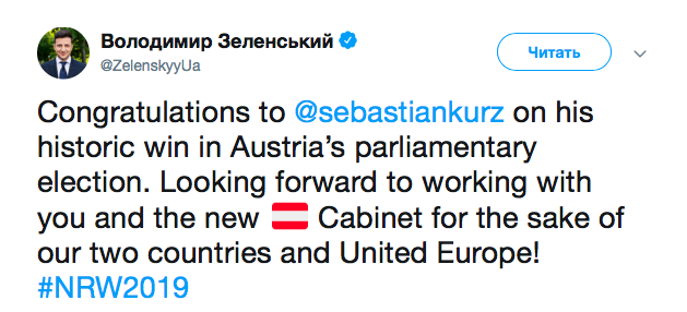 "Поздравления Себастьяну Курцу с исторической победой на парламентских выборах в Австрии. Будем рады сотрудничеству с вами и новым австрийским правительством ради наших двух стран и единой Европы", – отметил Зеленский.