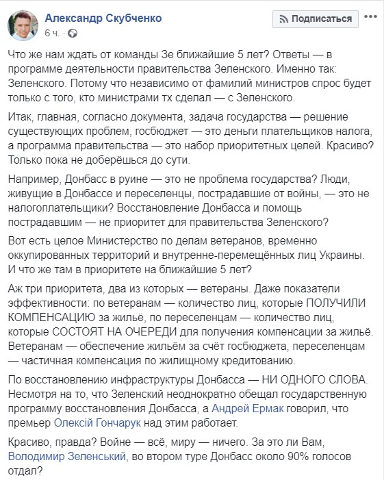 "Красиво, правда? Войне — всё, миру — ничего. За это ли Вам, Володимир Зеленський, во втором туре Донбасс около 90% голосов отдал?", - отметил Скубченко.