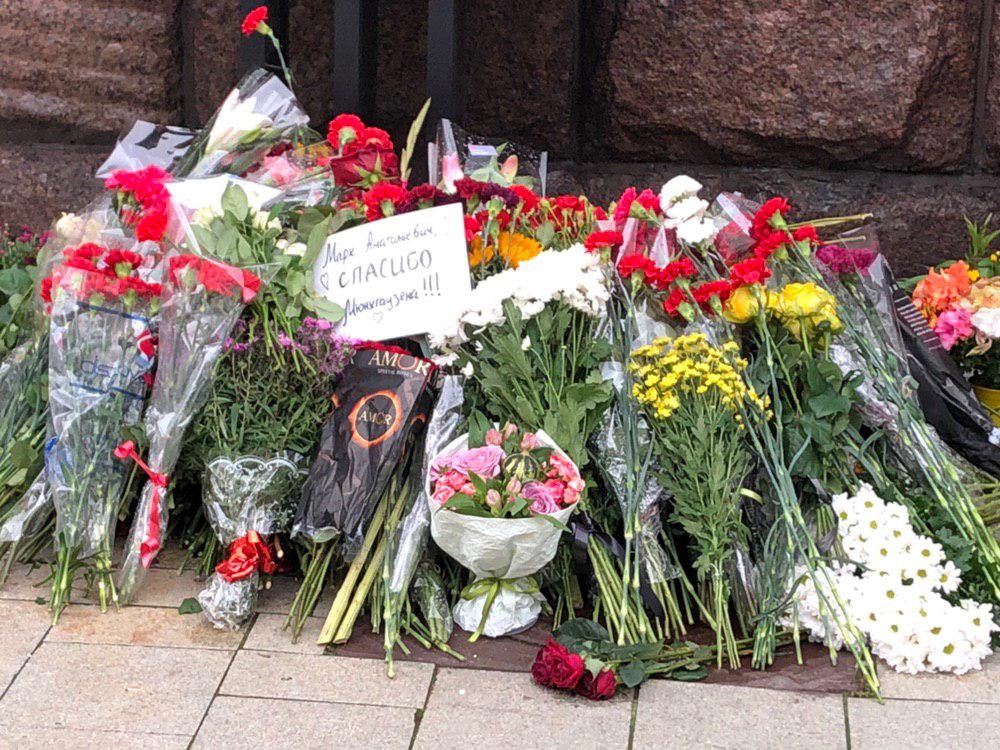 На улице возле афиши цветы с благодарностью Марку Анатольевичу. Фото: Страна.ua