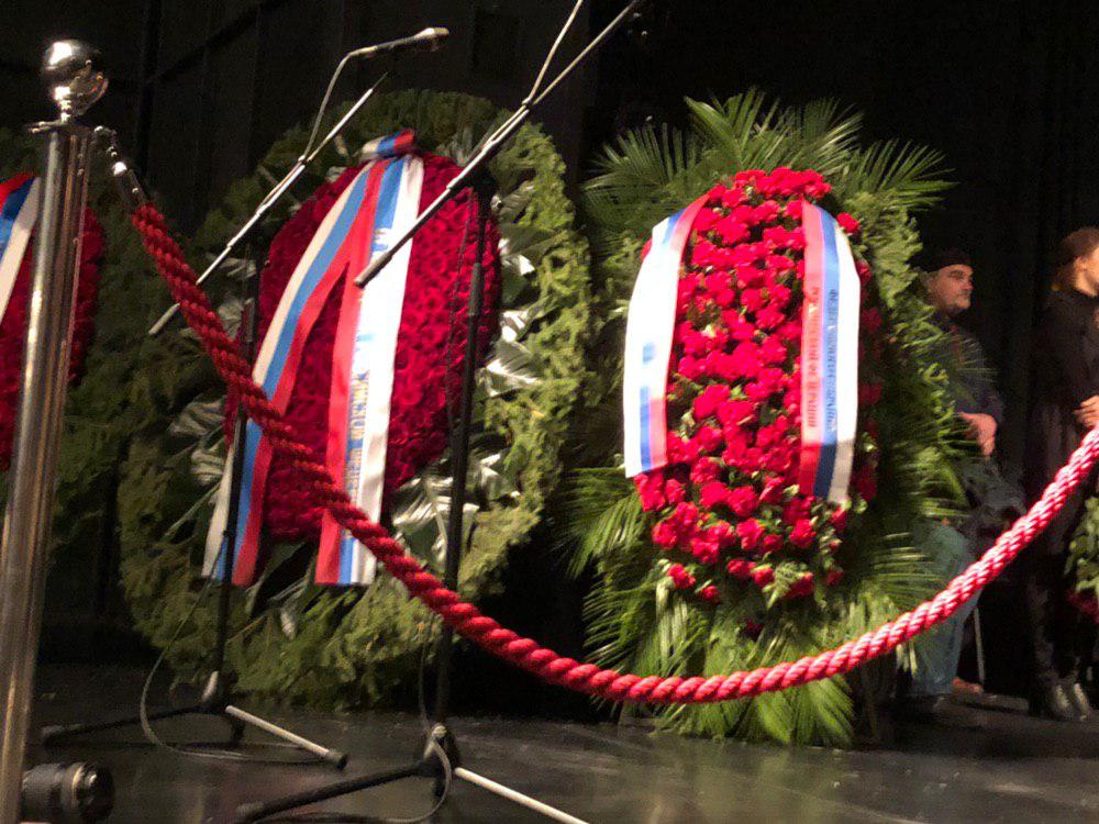 На сцене выставлены венки - от президента, правительства, от супруги премьер-министра Светланы Медведевой, от Никиты Михалкова, МХТ им. Чехова, депутатов Госдумы.