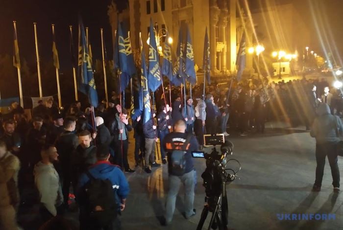 Лидер "Нацкорпуса" Андрей Билецкий заявил в Facebook  о "бессрочной акции против капитуляции"."Подписание формулы Штайнмайера  - фактически это значит федерализовать страну, фактически это значит, что Украина сама узаконит на собственной территории пророссийские территориальные анклавы. Сегодня произошло то, что Черчилль называл: "Сначала мы получим позор, а затем и войну". Зеленский предал 16 тысяч погибших на фронте украинцев.  Мы, патриоты, ветераны объявляем бессрочную акцию. Мы обращаемся ко всем украинцам выходить сегодня на Банковую...", - заявил Билецкий.