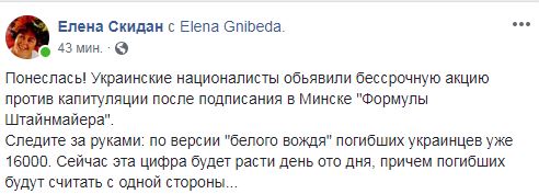"Понеслась! Украинские националисты объявили бессрочную акцию против капитуляции после подписания в Минске "Формулы Штайнмайера". Следите за руками: по версии "белого вождя" погибших украинцев уже 16000. Сейчас эта цифра будет расти день ото дня, причем погибших будут считать с одной стороны...", - пишет в Facebook Елена Скидан.