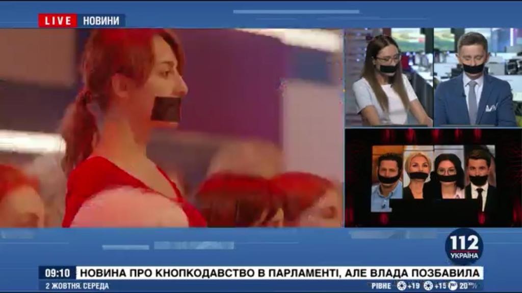 На полчаса каналы прекратили активное вещания. В знак протеста против цензуры они показывают кадры с людьми, которые находятся в студиях с заклеенными черным скотчем ртами.