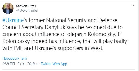 "Бывший секретарь Совета национальной безопасности и обороны Украины Данилюк заявил, что подал в отставку из-за беспокойства о влиянии олигарха Коломойского. Если Коломойский действительно имеет влияние, это плохо будет воспринято Международным валютным фондом и теми, кто поддерживает Украину на Западе", - отметил Пайфер.
