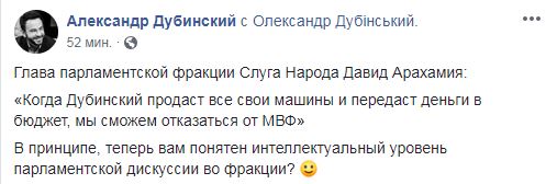 Так он ответил на выпад главы парламентской фракции Слуги народа Давида Арахамии о себе: "Когда Дубинский продаст все свои машины и передаст деньги в бюджет, мы сможем отказаться от МВФ". "В принципе, теперь вам понятен интеллектуальный уровень парламентской дискуссии во фракции?, - резюмирует Дубинский.