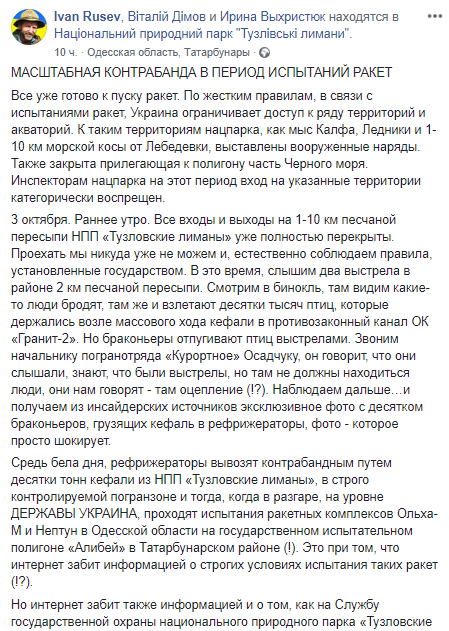 "Средь бела дня, рефрижераторы вывозят контрабандным путем десятки тонн кефали из НПП "Тузловские лиманы", в строго контролируемой погранзоне и тогда, когда в разгаре, на уровне держава Украина, проходят испытания ракетных комплексов Ольха-М и Нептун в Одесской области на государственном испытательном полигоне "Алибей" в Татарбунарском районе (!)" - добавляет эколог.