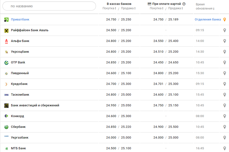 В банках курс доллара с утра был такой: покупка от 24,45 до 24,75 грн, продажа от 24,95 до 25,25 грн.