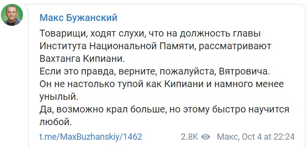 "Товарищи, ходят слухи, что на должность главы Института Национальной Памяти, рассматривают Вахтанга Кипиани. Если это правда, верните, пожалуйста, Вятровича.Он не настолько тупой как Кипиани и намного менее унылый. Да, возможно крал больше, но этому быстро научится любой", - говорится в сообщении.