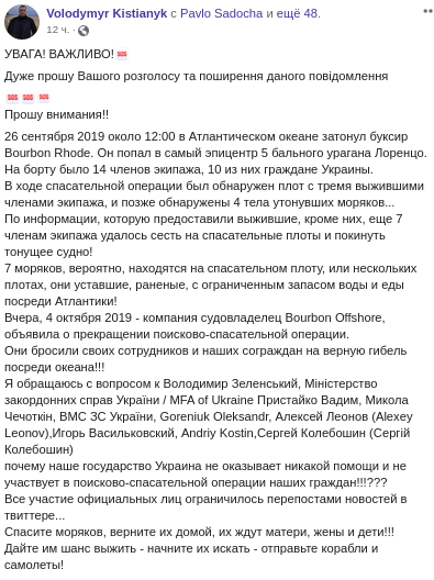 Юрист добавил, что 4 октября 2019 компания-судовладелец Bourbon Offshore, объявила о прекращении поисково-спасательной операции. Юрист обратился к руководству страны с просьбой спасти моряков, вернуть их домой, отправить на поиски корабли и самолеты. Также он отметил, что все участие официальных лиц ограничилось репостами новостей в Twitter.