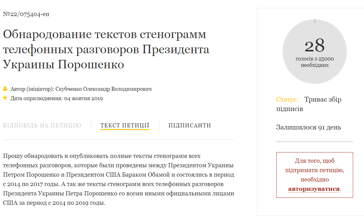 На сайте президента появилась петиция с требованием обнародовать стенограммы разговоров Порошенко с американцами