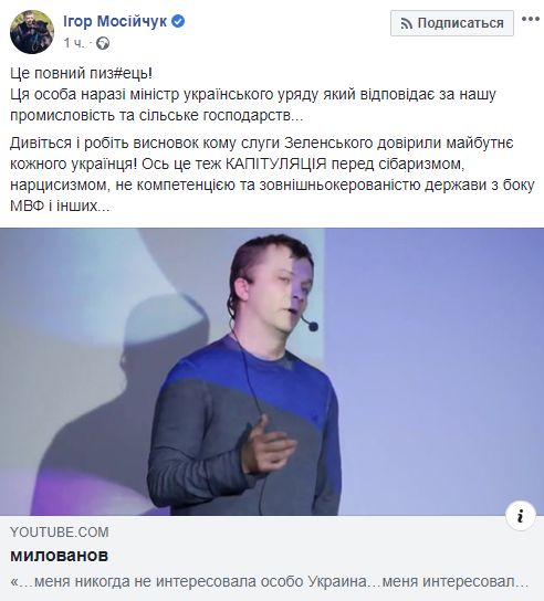 Так, экс-нардеп Игорь Мосийчук пишет: "Это полный пиз # ец! Этот человек сейчас министр украинского правительства отвечающий за нашу промышленность и сельское хозяйство...