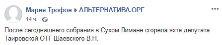 В ночь на 7 октября на причале в селе Бурлачья Балка Одесской области горела яхта, принадлежащая депутату Таировской объединенной территориальной громады Всеволоду Шаевскому. Об этом сообщают очевидцы события в соцсети.