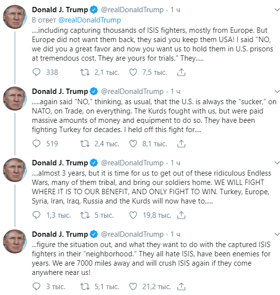 "Курды сражались вместе с нами, но им выплачивались огромные деньги и предоставлялась техника для этого. Они воевали с Турцией в течением десятилетий... пришло время нам выйти из этих смехотворных бесконечных войн, многие из них ведутся между племенами, и вернуть наших солдат домой", - написал Трамп в Twitter.