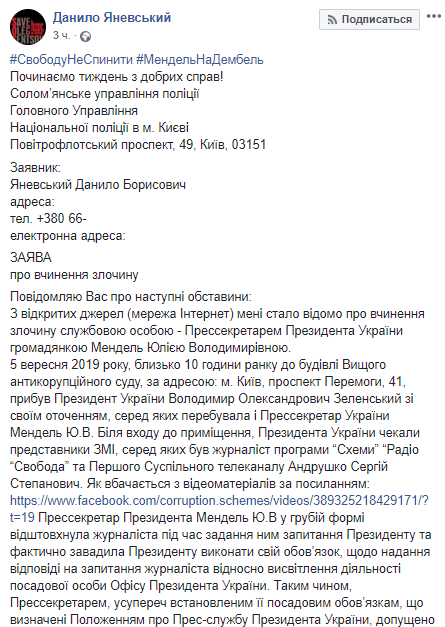 Украинский журналист Даниил Яневский подал заявление в Соломенский райотдел Нацполиции на спикера Владимира Зеленского Юлию Мендель за то, что она оттолкнула от президента журналиста, который хотел задать ему вопрос. Копию своего заявления Яневский опубликовал на странице в Facebook.