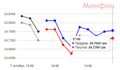 8 октября доллар в обменках подешевел на 10 копеек в покупке и на 7 копеек в продаже: вечером валюту покупают за 25 грн, продают за 25,08 грн. Межбанк закрылся практически вчерашними котировками: покупка - 24,73 грн и продажа - 24,76 грн. В банках вечером доллар покупают от 24,20 до 25 грн, продают - от 24,85 до 25,60 грн. В целом вторник показал колебания котировок валюты в среднем на 10 копеек как в сторону роста, так и в сторону снижения курса.