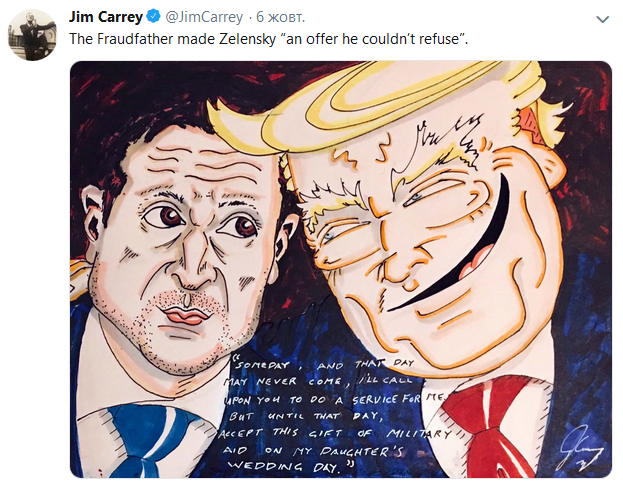 В США и не думает стихать скандал вокруг телефонного разговора президентов США и Украины, вовлекая в свою орбиту все новых и новых участников и критиков. Так, например, звезда Голливуда, всемирно известный актер Джим Керри в своем Twitter разместил карикатуру на Дональда Трампа и Владимира Зеленского.