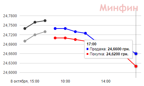 9 октября курс доллара в обменках за день снизился на 9-10 копеек: покупка - 24,92 грн, продажа - 24,99 грн. Межбанк закрылся снижением котировок на 10 копеек: 24,62 грн - покупка и 24,66 грн - продажа. В банках вечером доллар покупают от 24,30 до 24,86 грн, продают - от 24,80 до 25,60 грн.