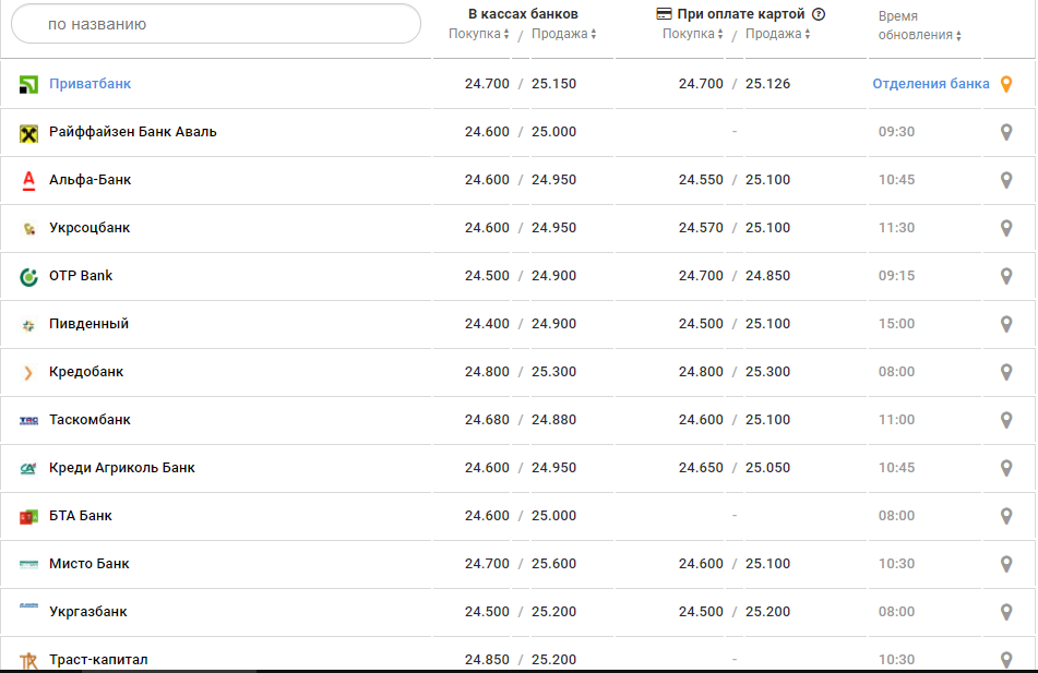 В банках курс доллара с утра был такой: покупка - от 24,20 до 25 грн, продажа - от 24,85 до 25,60 грн.