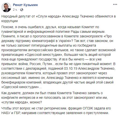 "Помните, я писал о проголосованном законопроекте "Про державу підтримку кінематографії в Україні"? Так вот, став законом, он не только заложит пятипроцентные выплаты из госбюджета производителям антироссийских фильмов, но также сделает возможной приватизацию "Одесской киностудии", большая часть акций которой пока еще принадлежит государству. И все бы ничего - все уже привыкли: война, Россия, Путин… если бы не один пикантный момент. В соответствии с декларацией, поданной 03.10.19 Александром Ткаченко, руководителем Комитета, который провел этот законопроект через сессионный зал, именно он, Александр Ткаченко и является конечным бенефициаром компаний, владеющих другой частью акций этой самой "Одесской киностудии", - написал он.