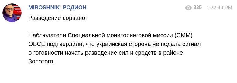 Об этом же в своем Telegram-канале заявил представитель "ЛНР" в политической группе на Минских переговорах Родион Мирошник: