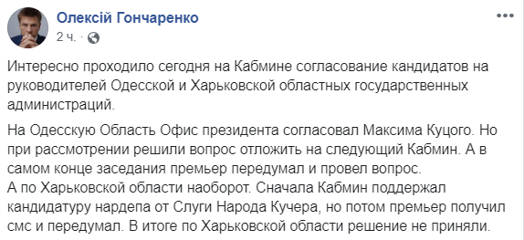 "Интересно проходило сегодня на Кабмине согласование кандидатов на руководителей Одесской и Харьковской областных государственных администраций.
