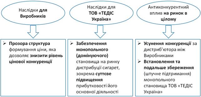 Антимонопольный комитет отмечает, что собранными по делу доказательствами подтверждено, что поведение этих компаний было согласованным, а результатом сотрудничества с единственным и общим для всех производителей дистрибьютором на рынке первичной продажи сигарет стало создание и поддержание искусственных барьеров, препятствовавших выходу на рынок других субъектов хозяйствования. В АМКУ отмечают, что производители табачных изделий "установили такие условия для заключения договоров с другими, кроме Тедис, потенциальными дистрибьюторами, которые делали просто невозможным их появление на этом рынке".