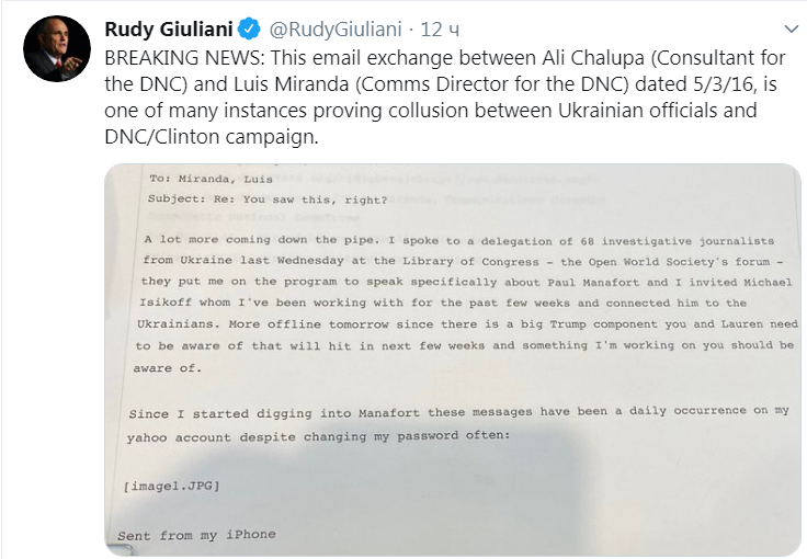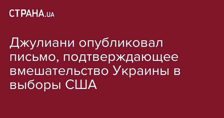 Адвокат президента США Дональда Трампа Рудольф Джулиани опубликовал письмо, которое свидетельствует о вмешательстве Украины в выборы главы Белого дома 2016 года. Распечатка электронного послания появилась в Twitter юриста.