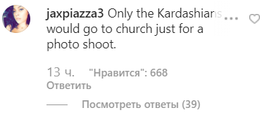 Некоторые подписчики осудили внешний вид и фото из святого места, выставленные на обозрение. "Только Кардашьяны ходят в церковь для фотосессии". Остальные пользователи восхищаются божественной красотой телезвезды и ее детей. "Вы и Норма выглядите потрясающе", "Какие чудесные дети", "Чикаго - милашка", "Невероятная семья", - пишут фанаты, которые лайкнули фото свыше 4 млн раз.