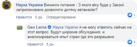 Подробностей Гео Лерос не сообщил. Однако, отвечая на комментарий о том, как будет решаться вопрос с детской эвтаназией, нардеп написал, что перед тем, как закон отправится в парламент, планируются широкие обсуждения и будет проанализирован опыт стран, где это разрешено.