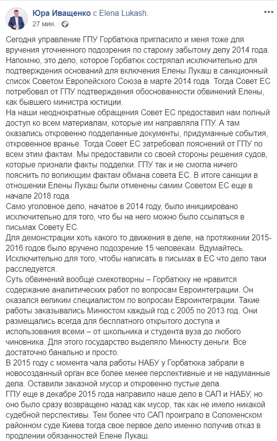 "Сегодня управление ГПУ Горбатюка пригласило и меня тоже для вручения уточненного подозрения по старому забытому делу 2014 года. Напомню, это дело, которое Горбатюк состряпал исключительно для подтверждения оснований для включения Елены Лукаш в санкционный список Советом Европейского Союза в марте 2014 года. Тогда Совет ЕС потребовал от ГПУ подтверждения обоснованности обвинений Елены, как бывшего министра юстиции", - написал Иващенко.