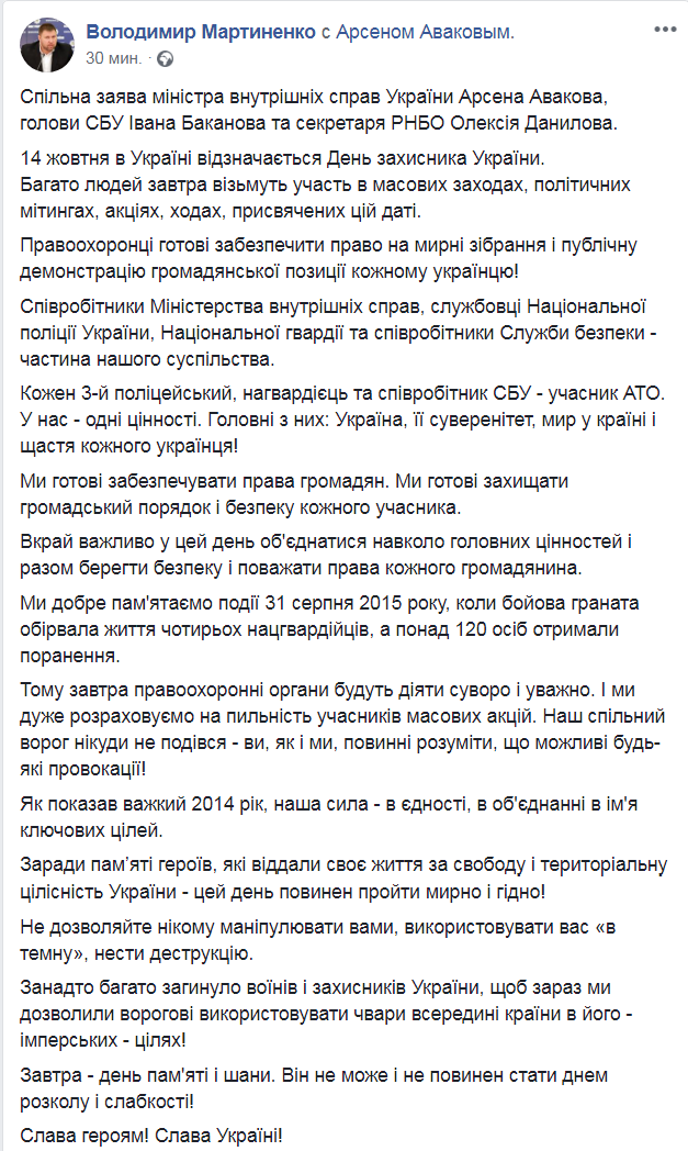 Об этом говорится в совместном заявлении министра внутренних дел Украины Арсена Авакова, главы Службы безопасности Украины Ивана Баканова и секретаря Совета национальной безопасности и обороны Украины Алексея Данилова, опубликованном на Facebook советником Авакова Владимиром Мартыненко.