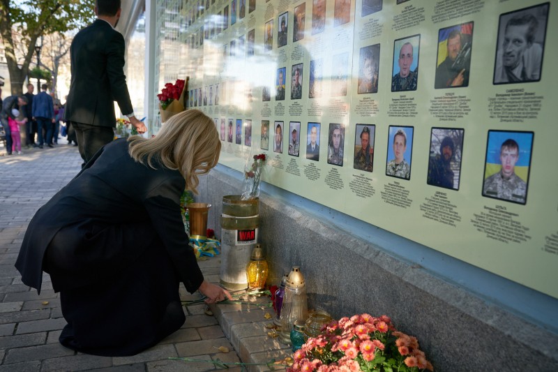 По случаю Дня защитника Отечества, который сегодня отмечают в Украине, президент Владимир Зеленский и первая леди Елена Зеленская пришли к Стене памяти павших за Украину, которая расположена у Михайловского Златоверхого монастыря в Киеве. Об этом сообщается на сайте главы государства.