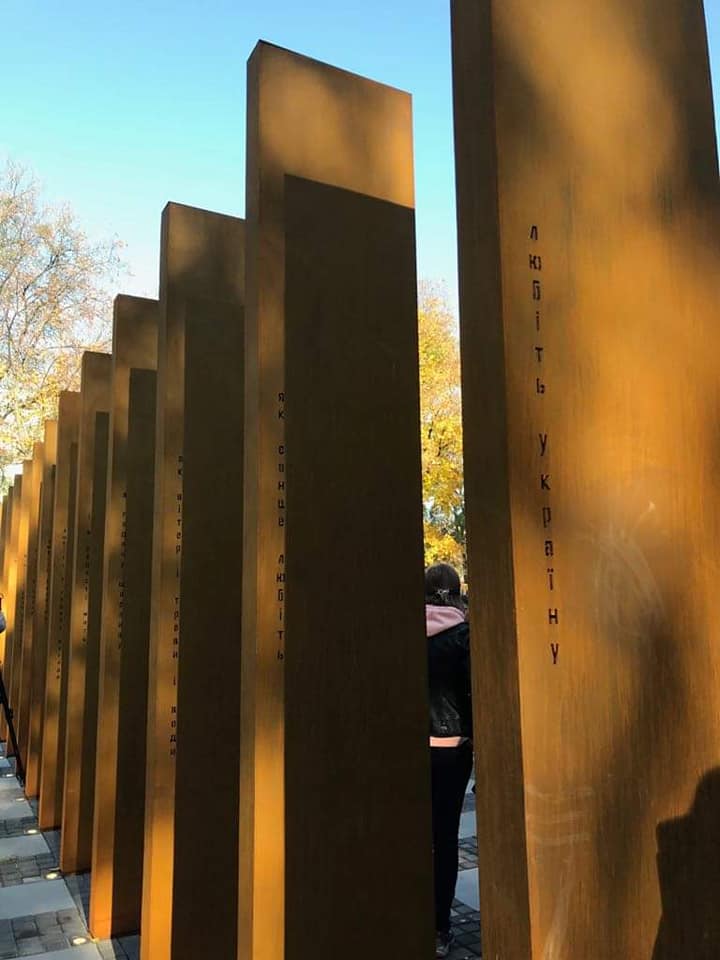 Рядом с монументом установлены 14 колонн со строками из стихотворения Владимира Сосюры "Любите Украину". Стелы символизируют год начала войны – 2014-й.