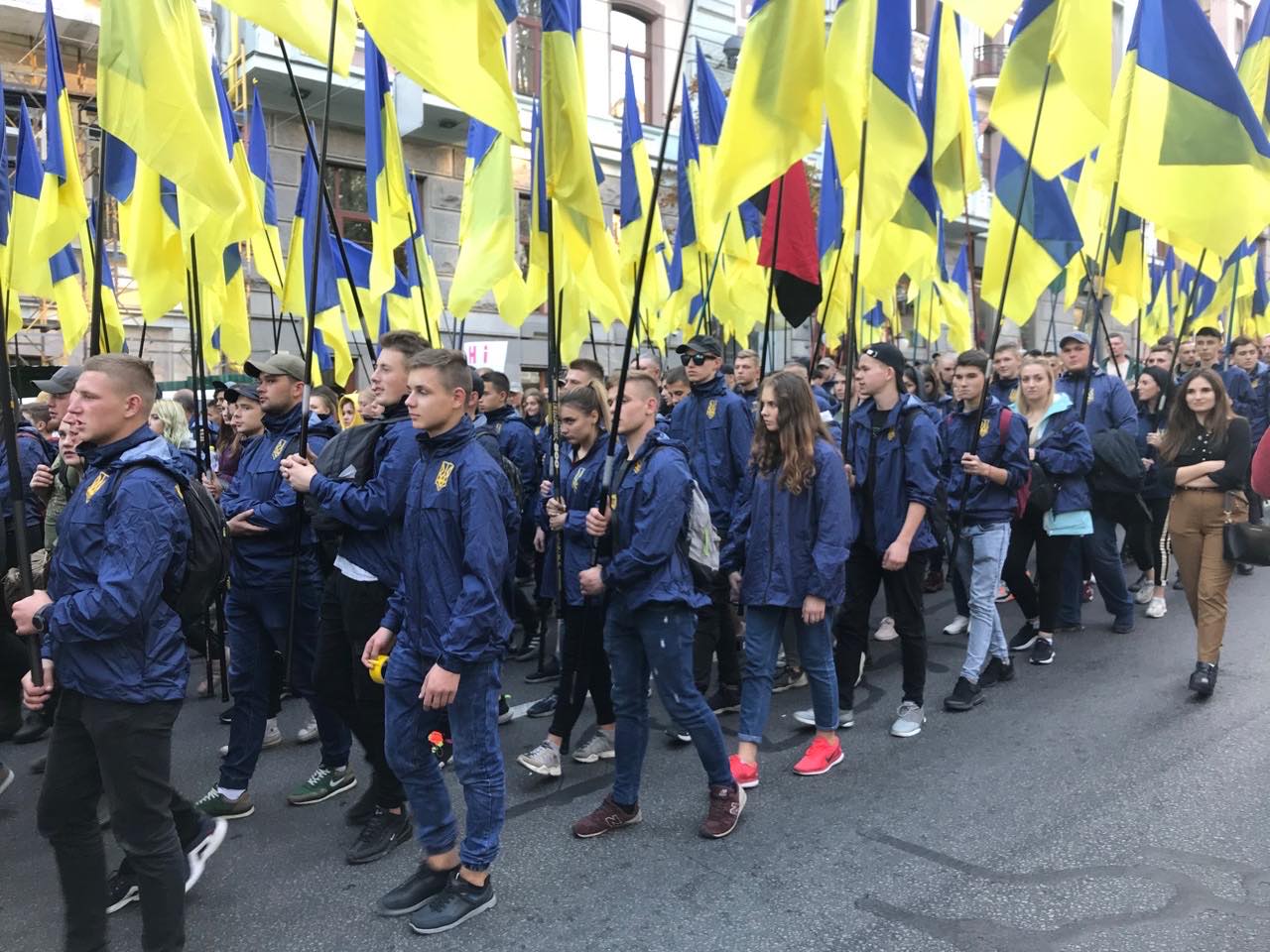 Традиционно это день торжеств для националистов и ветеранов АТО. А в этом году его превращают в политическую манифестацию: сегодняшний марш прошел в рамках Штайнмайер-майдана - акций против разведения войск и выборов на Донбассе.