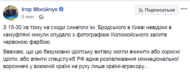 На лестницу синагоги им. Бродского в Киеве 14 октября неизвестные в камуфляже бросили чучело с фотографией Коломойского вместо лица, залитое красной краской. Об этом сообщил на Facebook бывший народный депутат Игорь Мосийчук.