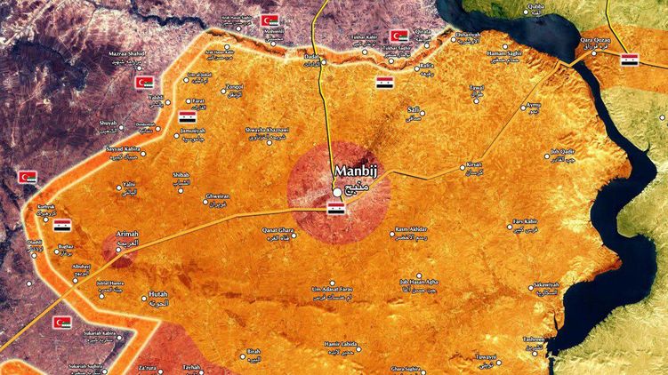 Сообщается, что в американские военные базы у населенных пунктов Умм Мийяль и Дадат зашли сирийские солдаты. Они начали готовится к возможному сдерживанию турецких формирований, подходящих к городу с севера. Осуществлять контроль за территорией рядом с Манбиджем им помогает российская военная полиция, которая контактирует с турецкими войсками.
