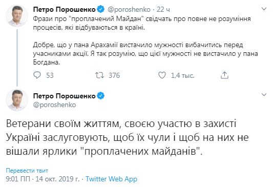 "Фразы о "проплаченном Майдане" свидетельствуют о полном непонимании процессов, которые происходят в стране. Хорошо, что у господина Арахамии хватило мужества извиниться перед участниками акции. Я так понимаю, что этого мужества не хватило у господина Богдана", - написал Порошенко в своем Twitter.