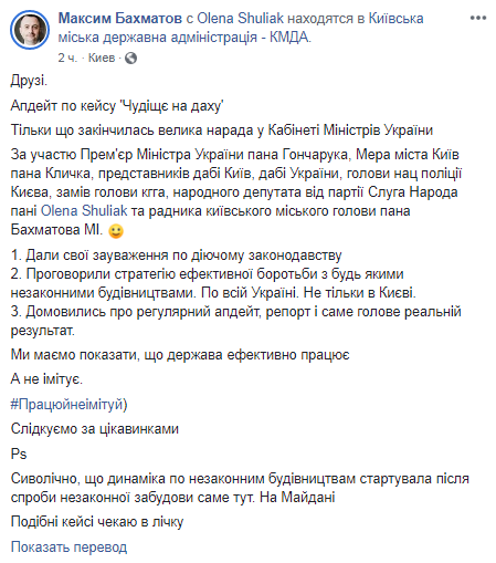 И уже 15 октября (первый пост появился 12 октября - Ред.) в Кабмине прошло заседание по поводу борьбы с незаконными застройками. На нем присутствовали премьер Алексей Гончарук, мэра Киева Виталий Кличко, представители ГАСИ Киева, ГАСИ Украины, глава Нацполиции Киева, замы председателя КГГА, нардеп от "Слуга народа" Елены Шуляк и советник киевского мэра Максим Бахматов. Об этом в сети написал сам Бахматов.